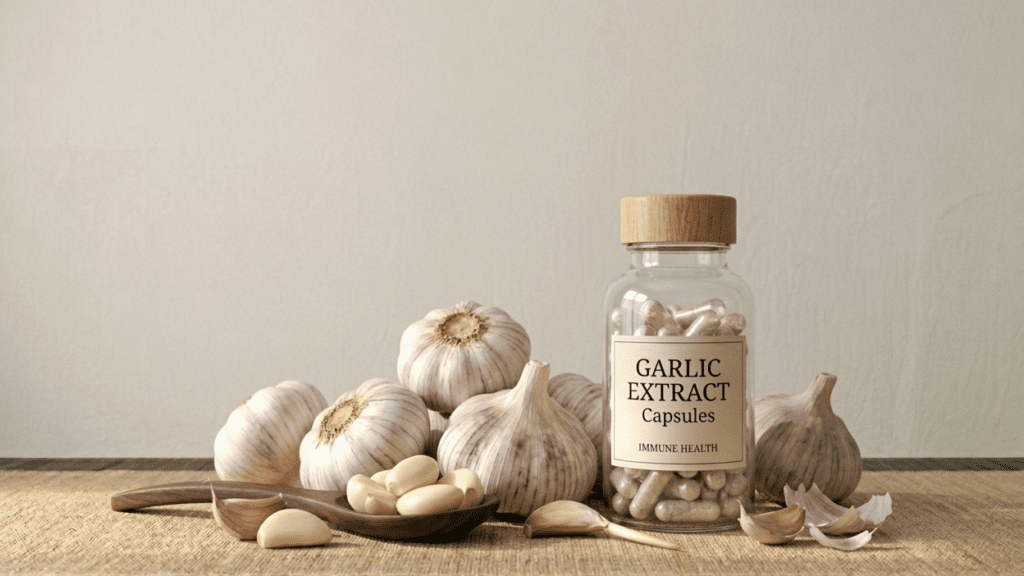 Garlic supplements are commonly taken in capsule or aged extract form to provide consistent intake without the strong taste associated with raw garlic.